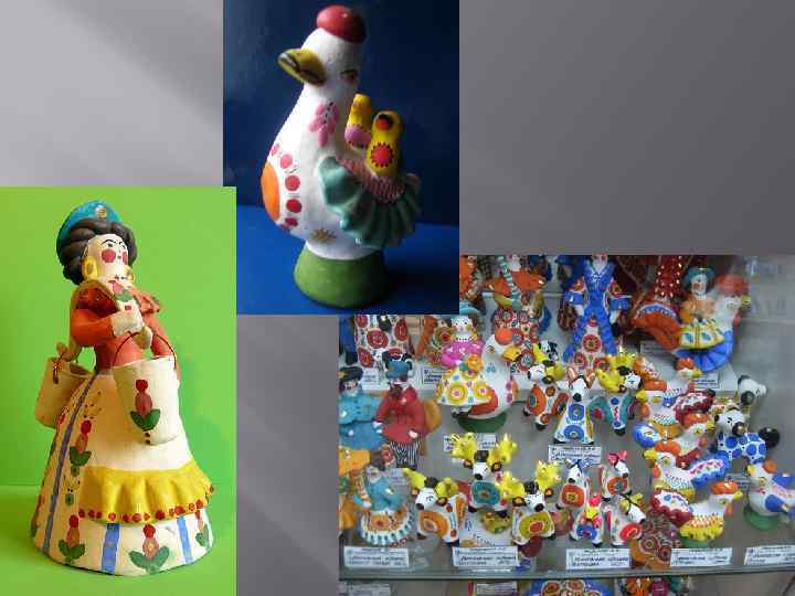 Игрушки Ды мковская игрушка — один из русских народных глиняных художественных промыслов. Возник в заречной слободе Дымково близ г. Вятка (ныне на территории г. Кирова). Аналог дымковской игрушки отсутствует. Яркая, нарядная дымковская игрушка стала своеобразным символом Вятской земли.
