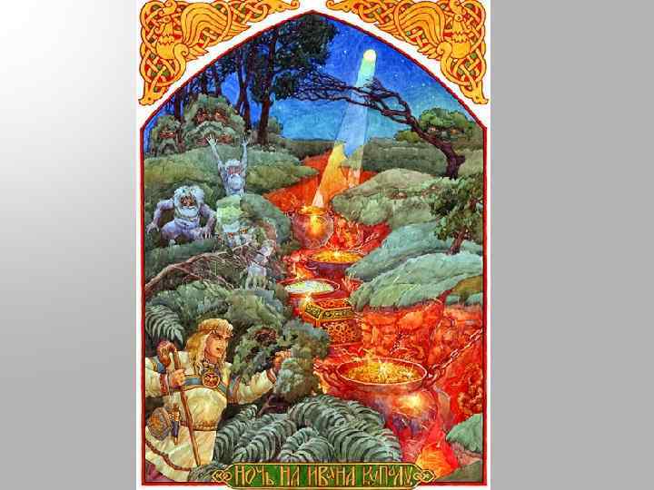 Купало КУПАЛО (Купайла) — плодотворящее божество лета, летняя ипостась бога Солнца. «Купало, яко же мню, бяше бог обилия, яко же у еллинь Цересъ, ему же безумный за обилие благодарение приношаху въ то время, егда имяше настати жатва» . Его праздник посвящен дню летнего солнцестояния, самому долгому дню в году. Священной была и ночь, накануне этого дня – Ночь накануне Купало. Всю эту ночь продолжались пирования, игрища и массовые купания в водоемах. Ему жертвовали перед сбором хлеба, 23 июня, в день св. Агриппины, которая и была прозвана в народе Купальницей. Молодые люди украшались венками, раскладывали огонь, плясали вокруг него и воспевали Купалу. Игрища продолжались всю ночь. Кое-где 23 июня топили бани, настилали в них траву купальницу (лютик) и после купались в реке. В самое Рождество Иоанна Предтечи, сплетая венки, вешали их на кровли домов и на хлевах, чтобы удалить злых духов от жилища.