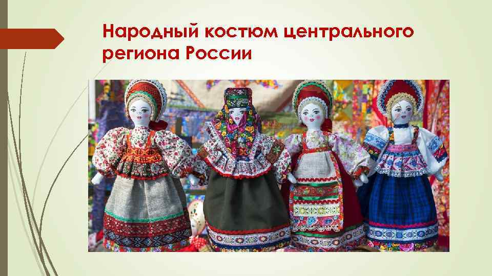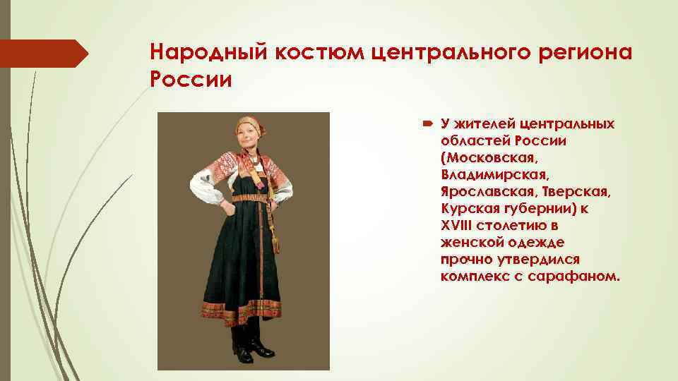 Народный костюм центрального региона России У жителей центральных областей России (Московская, Владимирская, Ярославская, Тверская, Курская губернии) к XVIII столетию в женской одежде прочно утвердился комплекс с сарафаном.
