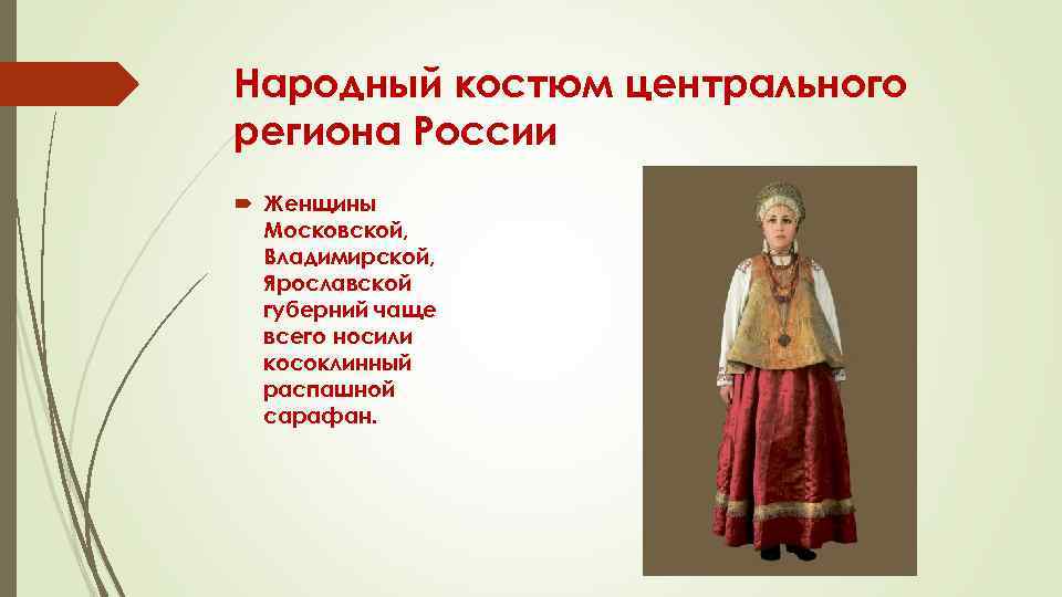 Народный костюм центрального региона России Женщины Московской, Владимирской, Ярославской губерний чаще всего носили косоклинный распашной сарафан.