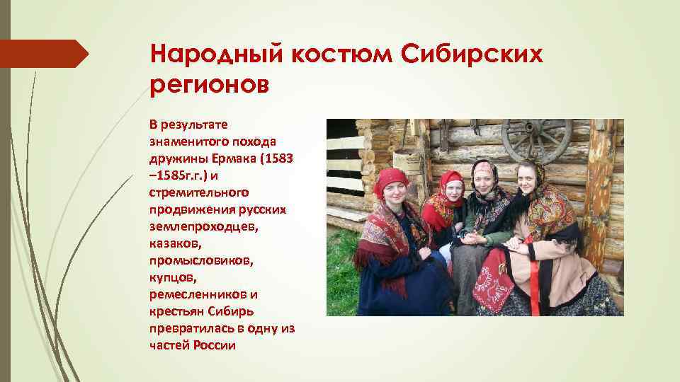 Народный костюм Сибирских регионов В результате знаменитого похода дружины Ермака (1583 – 1585 г. г. ) и стремительного продвижения русских землепроходцев, казаков, промысловиков, купцов, ремесленников и крестьян Сибирь превратилась в одну из частей России