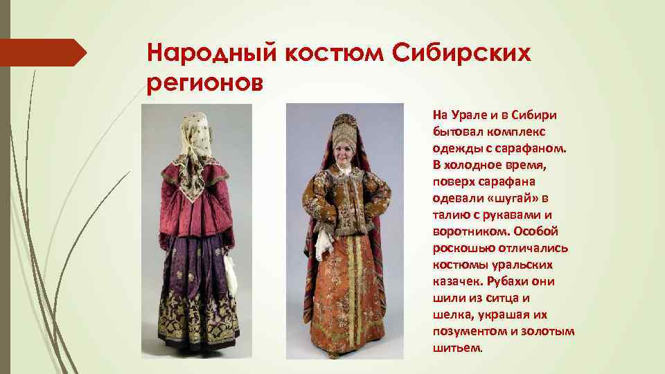 Народный костюм Сибирских регионов На Урале и в Сибири бытовал комплекс одежды с сарафаном. В холодное время, поверх сарафана одевали «шугай» в талию с рукавами и воротником. Особой роскошью отличались костюмы уральских казачек. Рубахи они шили из ситца и шелка, украшая их позументом и золотым шитьем.