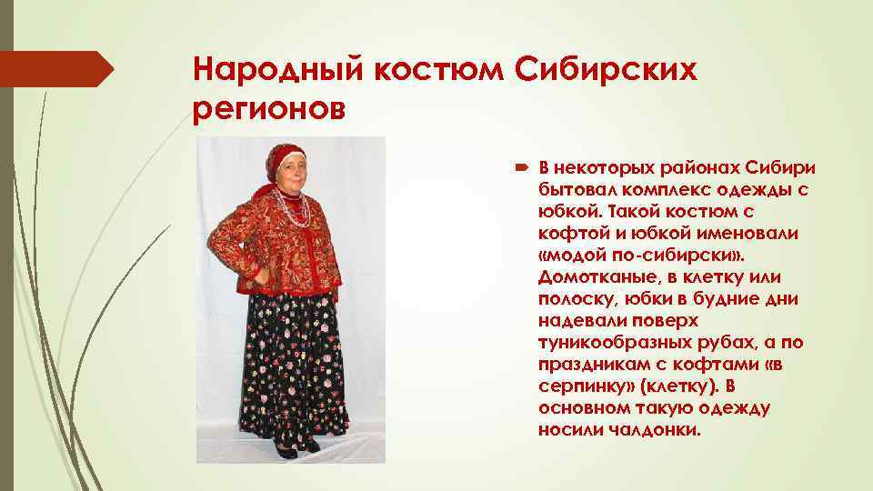 Народный костюм Сибирских регионов В некоторых районах Сибири бытовал комплекс одежды с юбкой. Такой костюм с кофтой и юбкой именовали «модой по-сибирски» . Домотканые, в клетку или полоску, юбки в будние дни надевали поверх туникообразных рубах, а по праздникам с кофтами «в серпинку» (клетку). В основном такую одежду носили чалдонки.