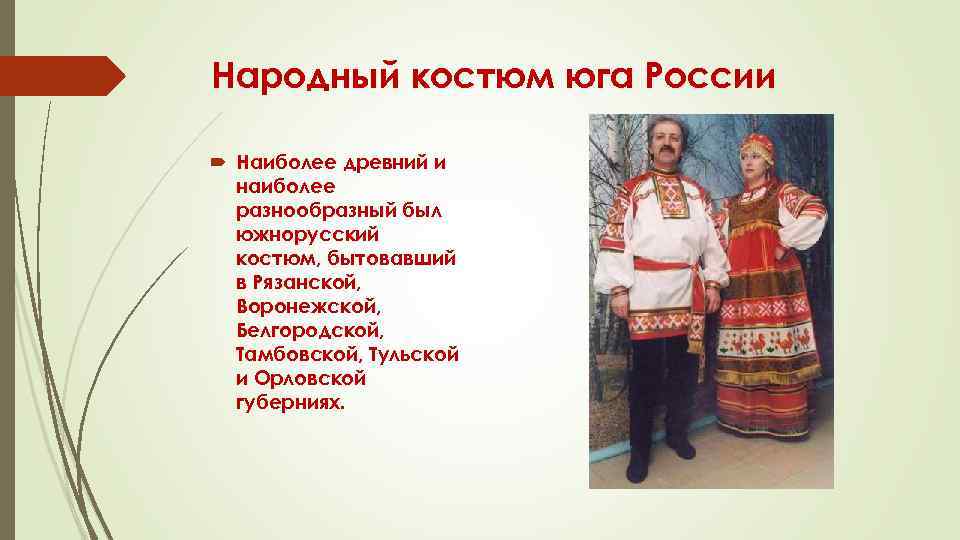 Народный костюм юга России Наиболее древний и наиболее разнообразный был южнорусский костюм, бытовавший в Рязанской, Воронежской, Белгородской, Тамбовской, Тульской и Орловской губерниях.