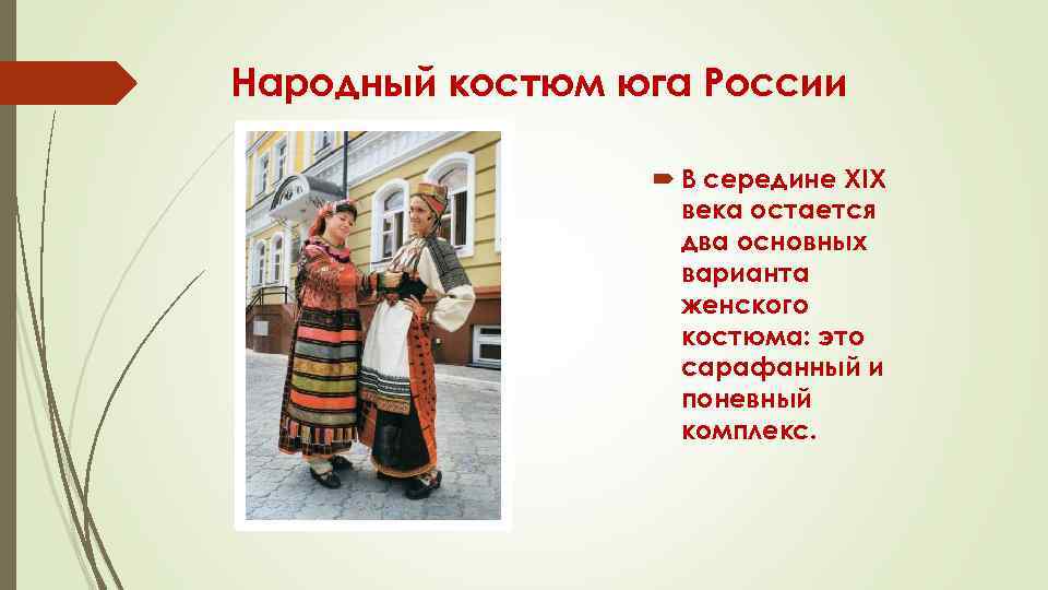 Народный костюм юга России В середине XIX века остается два основных варианта женского костюма: это сарафанный и поневный комплекс.