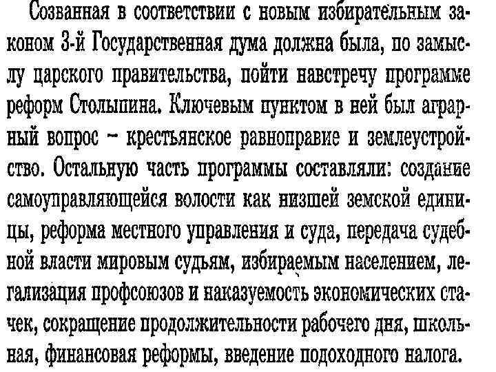 Третьеиюньский государственный переворот означал поражение революции 1905– 1907 гг. в России, временную победу сил контрреволюции. Начался период массовых и жестоких репрессий. Руководил подавлением революционного движения 44–х летний председатель Совета Министров (совмещая эту должность с должностью Министра внутренних дел) П. А. Столыпин (1862– 1911 гг. ). Он поощрял деятельность военно–полевых судов и применение смертной казни; его именем веревка для повешения стала называться в народе "столыпинским галстуком". Царское самодержавие, устоявшее в 1905 г. , собиралось с силами, соединилось с помещиками и капиталистами в III Думе и снова ввело в России старые порядки. Усилился гнет капиталистов над рабочими, произвол чиновников в городе и особенно в деревне.