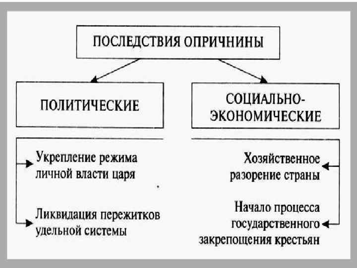 • • • Последствия опричнины 1. Объективно, опричнина не только не привела к усилению центральной власти, к чему стремился Иван IV, а скорее ослабила ее, вызвала острый общественно-политический кризис, поставивший страну на грань национальной катастрофы в годы Смуты - гражданской войны начала 17 в. 2. Опричный террор не привел и к уничтожению боярства и боярского землевладения, произошли только персональные изменения в составе этого правящего слоя, поднявшие на самый верх людей беспринципных, готовых ради личных интересов пойти на любое преступление. 3. Опричная политика не столько помогла России в Ливонской войне, сколько стала одной из причин ее поражения. Ослабляя ресурсы страны, парализуя страхом командный состав, она привела к тому, что Россия не сумела развить первоначальный успех и воспользоваться смутой, наступившей в Речи Посполитой после смерти в 1572 г. короля Сигизмунда II Августа. 4. Внутренняя политика и затяжная война привели к тяжелому экономическому кризису, разорению населения, его бегству из центра на окраины. Государство теряло налогоплательщиков, служилые люди - крестьян, а это подрывало боеспособность армии. Для преодоления кризисного положения власть пошла на запрет крестьянского "выхода". Отмена Юрьева дня в 1581 г. из временной и ограниченной меры переросла в постоянную, что привело к закрепощению крестьян. А это, в свою очередь, предопределило утверждение наиболее консервативного типа феодальных отношений, что затормозило развитие страны. 5. Опричнина породила и глубокий духовный кризис русского общества. Пошатнулась вера в царя как "земного бога", что подрывало основы православия. В итоге, складывались духовные предпосылки для Смуты.