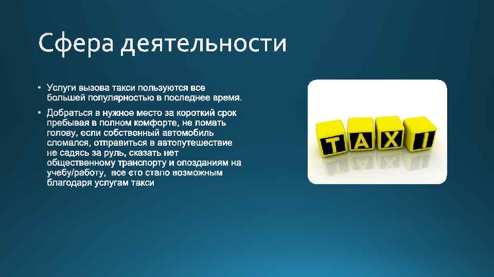 Выгоды Атрибуты Комфортабельная поездка Новая, чистая машина, музыка, кондиционер/печка и т. д. Безопасность Проверенный персонал, квалифицированный водитель со стажем Постоянство и своевременность Постоянное наличие свободных машин/водителей Экономия времени Возможность быстро добраться до пункта назначение Круглосуточная работа Вызов в любое удобное время Полноценный отдых Водитель за рулем Приемлемые цены Цена в зависимости от километража Дополнительные скидки и акции Наличие бонусных карт, спец. предложений Поездки в любые точки города и его окрестностей Наличие GPS-навигатора Доступ к информации не выходя из дома Интернет-сайт