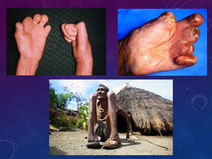 • Трофические расстройства у больных лепрой приводят к нарушению пигментации, к тяжелым осложнениям развитию мутиляции кистей, стоп. При этом вследствие значительных трофических нарушений (а не в результате инфильтративных процессов) происходит постепенное расслаивание костного скелета кистей или стоп, разрушение и деформация ногтей. Кисть или стопа становится мягкой, напоминая тюленью лапу или лапу лягушки.
