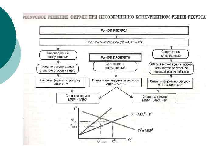 Зависимость: чем больше единиц ресурса использует фирма, тем ниже предельная производительность каждой из них. ¡ ¡ При закупке факторов производства фирма учитывает издержки каждой дополнительной единицы фактора производства – предельные издержки ресурса (MRC-marginal resource costs). На величину предельных издержек ресурса влияют цены предложения ресурса. На рынке СК цена ресурса постоянна, т. к. домохозяйства не влияют на цену предложения. Для фирмыпокупателя кривая предложения - это кривая ее предельных издержек (MRC).
