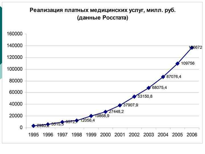 ОБЪЕМ И СТРУКТУРА ПЛАТНЫХ УСЛУГ НАСЕЛЕНИЮ В ОБЛАСТИ ЗДРАВООХРАНЕНИЯ И ОТДЫХА 1995 2000 2005 2006 В процентах к итогу Платные услуги населению - всего 100 100 медицинские 2, 6 4, 8 4, 9 санаторнооздоровительные 3, 4 2, 8 1, 6 1, 5 услуги физической культуры и спорта 0, 3 0, 4 0, 7 0, 6 из них: