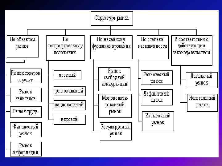Структура рынка: 3. по механизму функционирования 1. по объектам рынка • рынок свободной конкуренции • рынок товаров и услуг • монополизированный рынок • рынок капиталов • регулируемый рынок • рынок труда 4. по степени насыщенности • финансовый рынок • равновесный рынок • рынок информации • дефицитный рынок 2. по географ. • избыточный рынок положению • • местный региональный национальный мировой 5. в соответствии с действующим законодательством • легальный рынок • нелегальный рынок