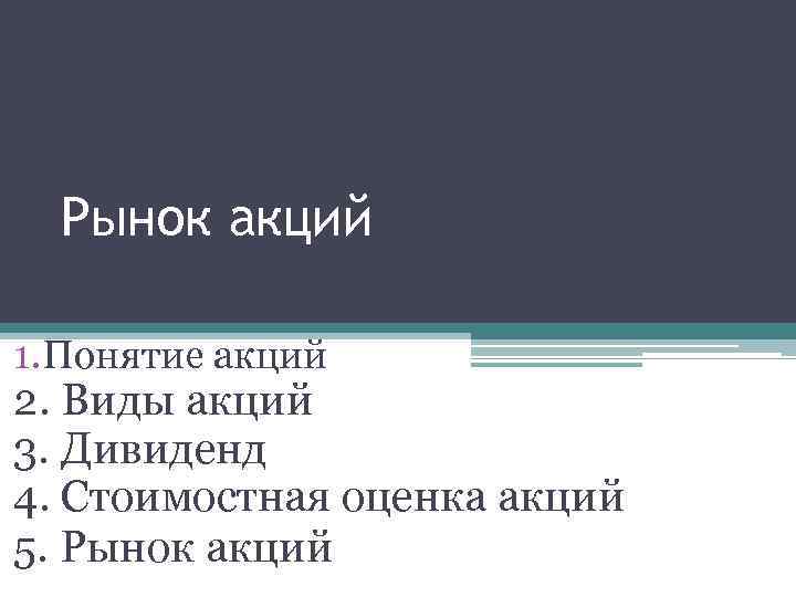 Рынок акций 1. Понятие акций 2. Виды акций 3. Дивиденд 4. Стоимостная оценка акций 5. Рынок акций