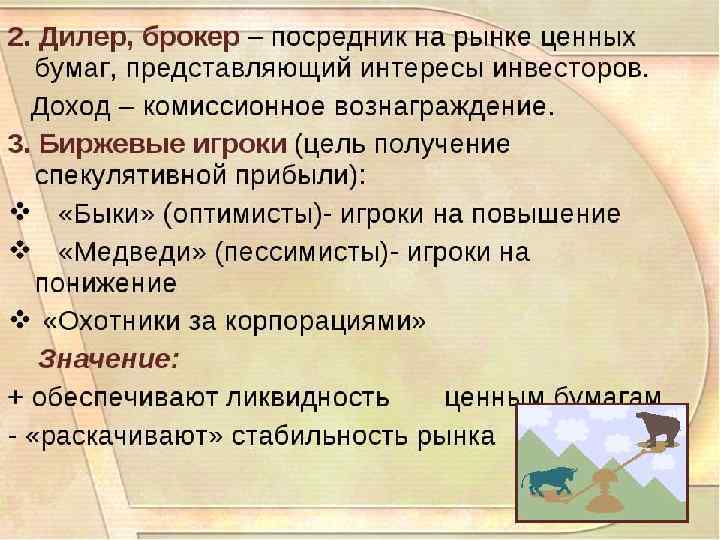 Участники рынка ценных бумаг Участников рынка ценных бумаг можно сгруппировать в пять основных групп: n эмитенты — осуществляют первичный выпуск ценных бумаг в обращение; n инвесторы — это всегда покупатели ценных бумаг; n фондовые посредники — это торговцы, обеспечивающие связь между эмитентами и инвесторами и имеющие государсвенные лицензии на соотвествующие посреднические виды деятельности (брокерские и дилерские услуги); n n брокеры — это участники рынка ценных бумаг, которые осуществляют операции за счет средств клиента(брокер может быть только юридическим лицом). дилеры — участники рынка ценных бумаг, осуществляют операции с ценными бумагами за свой счет (дилером может быть только юридическое лицо, являющееся коммерческой организацией). организации инфраструктуры; организации регулирования и контроля.