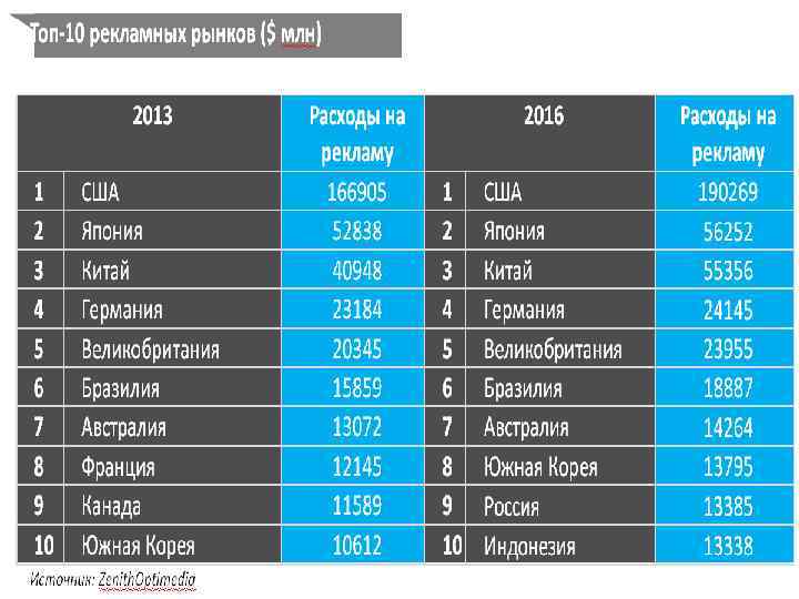 В Северной Америке наблюдается и прогнозируется самый значительный рост из-за большого объема рекламного бюджета компаний и высокого уровня развития мобильного мира. В Западной Европе мобильный канал станет более интегрированным в рекламные кампании, историческое распределение бюджета на печатную и радиорекламу сменится распределением бюджета в мобильный канал. Тихоокеанский регион и Япония являются зрелым рынком мобильной рекламы, что выливается в более сдержанные темпы роста за 2012 -2018 гг. Рост в данном регионе обеспечивается, преимущественно, за счет Китая и Индии. Рынок мобильной рекламы в мире