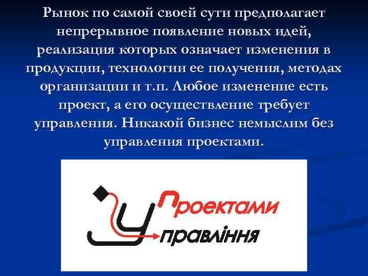 Рынок по самой своей сути предполагает непрерывное появление новых идей, реализация которых означает изменения в продукции, технологии ее получения, методах организации и т. п. Любое изменение есть проект, а его осуществление требует управления. Никакой бизнес немыслим без управления проектами.