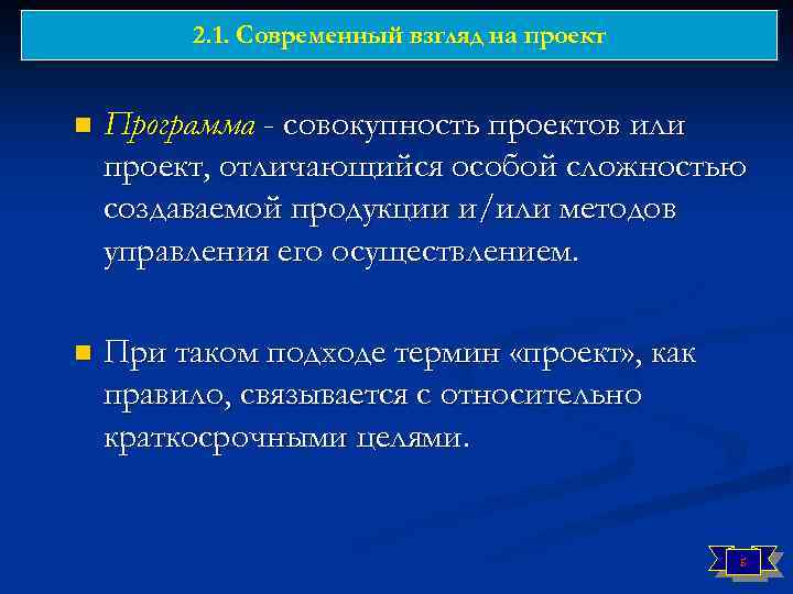 2. 1. Современный взгляд на проект n Программа - совокупность проектов или проект, отличающийся особой сложностью создаваемой продукции и/или методов управления его осуществлением. n При таком подходе термин «проект» , как правило, связывается с относительно краткосрочными целями. 5