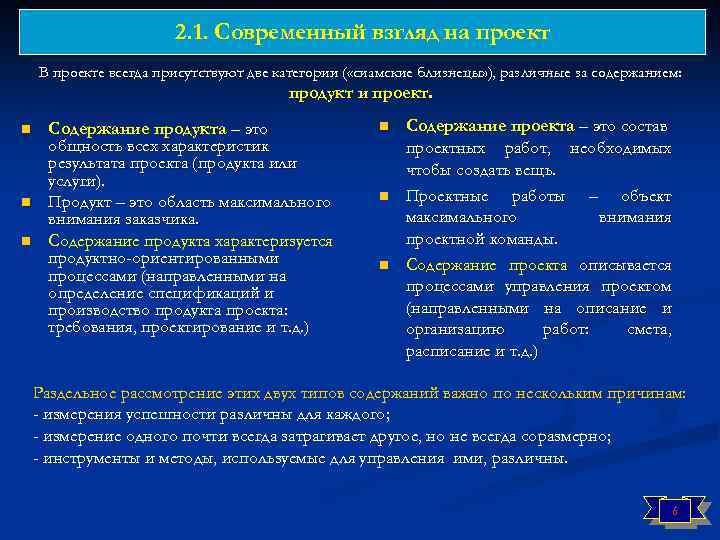 2. 1. Современный взгляд на проект В проекте всегда присутствуют две категории ( «сиамские близнецы» ), различные за содержанием: продукт и проект. n n n Содержание продукта – это общность всех характеристик результата проекта (продукта или услуги). Продукт – это область максимального внимания заказчика. Содержание продукта характеризуется продуктно-ориентированными процессами (направленными на определение спецификаций и производство продукта проекта: требования, проектирование и т. д. ) n n n Содержание проекта – это состав проектных работ, необходимых чтобы создать вещь. Проектные работы – объект максимального внимания проектной команды. Содержание проекта описывается процессами управления проектом (направленными на описание и организацию работ: смета, расписание и т. д. ) Раздельное рассмотрение этих двух типов содержаний важно по нескольким причинам: - измерения успешности различны для каждого; - измерение одного почти всегда затрагивает другое, но не всегда соразмерно; - инструменты и методы, используемые для управления ими, различны. 6