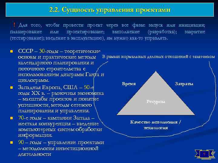 2. 2. Сущность управления проектами ! Для того, чтобы провести проект через все фазы: запуск или инициация; планирование или проектирование; выполнение (разработка); (тестирование); введение в эксплуатацию), им нужно как-то управлять. n n закрытие СССР – 30 -годы – теоретические основы и практические методы В рамках нормальных деловых отношений с заказчиком календарного планирования и поточного строительства с использованием диаграмм Ганта и циклограмм. Время Затраты Западная Европа, США – 50 -е годы ХХ в. – рыночная экономика – масштабы проектов и понятие Ресурсы успешности, методы сетевого планирования и управления. 70 -е годы – кампании Запада – Качество исполнения / жесткая конкуренция – введение технология компьютерных систем обработки информации. 90 – годы – управление проектами – методология инвестиционной 7 деятельности
