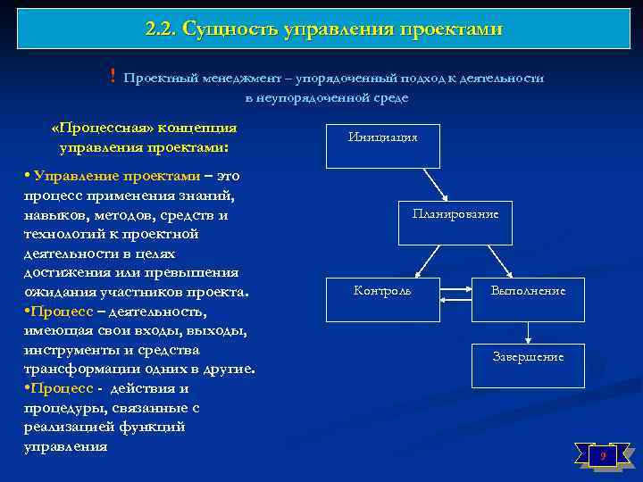 2. 2. Сущность управления проектами ! Управление проектами – синтетическая дисциплина, объединяющая специальные и надпрофессиональные знания. Методы управления проектами позволяют: - определить цели проекта и провести его обоснование; - выявить структуру проекта (подцели, основные этапы работы, которые предстоит выполнить); - определить необходимые объемы и источники финансирования; - подобрать исполнителей — в частности, через процедуры торгов и конкурсов; - подготовить и заключить контракты; - определить сроки выполнения проекта, составить график его реализации, рассчитать необходимые ресурсы; - рассчитать смету и бюджет проекта; - планировать и учитывать риски; - обеспечить контроль за ходом выполнения проекта и многое другое. n Управление проектами — методология (говорят также — искусство) организации, планирования, руководства, координации трудовых, финансовых и материальнотехнических ресурсов на протяжении проектного цикла, направленная на эффективное достижение его целей путем применения современных методов, техники и технологии управления для достижения определенных в проекте результатов по составу и объему работ, стоимости, времени, качеству и удовлетворению участников проекта. 8