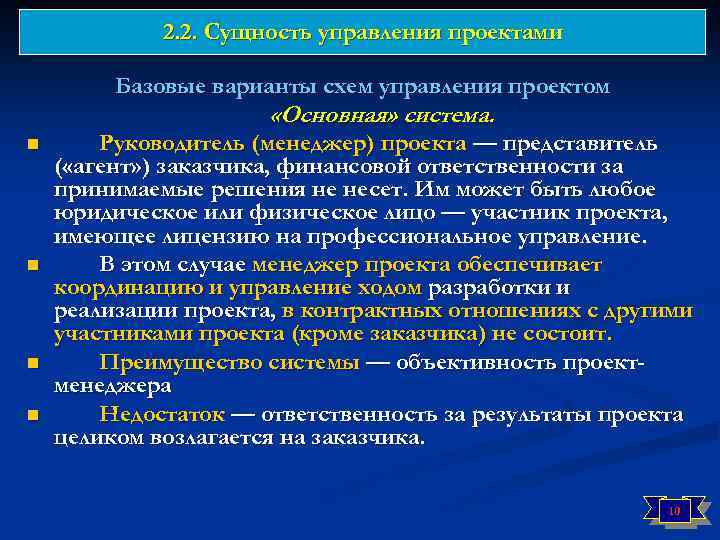 2. 2. Сущность управления проектами Базовые варианты схем управления проектом «Основная» система. n n Руководитель (менеджер) проекта — представитель ( «агент» ) заказчика, финансовой ответственности за принимаемые решения не несет. Им может быть любое юридическое или физическое лицо — участник проекта, имеющее лицензию на профессиональное управление. В этом случае менеджер проекта обеспечивает координацию и управление ходом разработки и реализации проекта, в контрактных отношениях с другими участниками проекта (кроме заказчика) не состоит. Преимущество системы — объективность проектменеджера Недостаток — ответственность за результаты проекта целиком возлагается на заказчика. 10