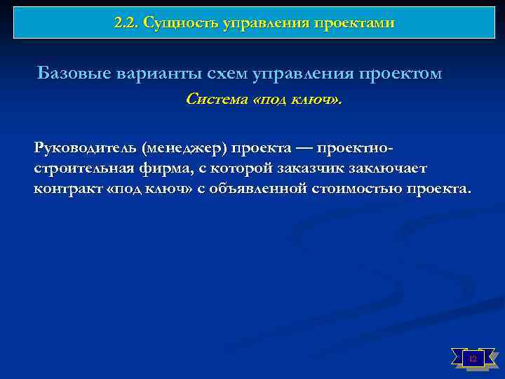 2. 2. Сущность управления проектами Базовые варианты схем управления проектом Система «под ключ» . Руководитель (менеджер) проекта — проектностроительная фирма, с которой заказчик заключает контракт «под ключ» с объявленной стоимостью проекта. 12