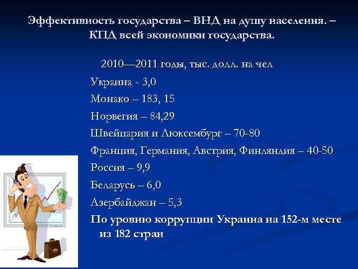 Эффективность государства – ВНД на душу населения. – КПД всей экономики государства. 2010— 2011 годы, тыс. долл. на чел Украина - 3, 0 Монако – 183, 15 Норвегия – 84, 29 Швейцария и Люксембург – 70 -80 Франция, Германия, Австрия, Финляндия – 40 -50 Россия – 9, 9 Беларусь – 6, 0 Азербайджан – 5, 3 По уровню коррупции Украина на 152 -м месте из 182 стран