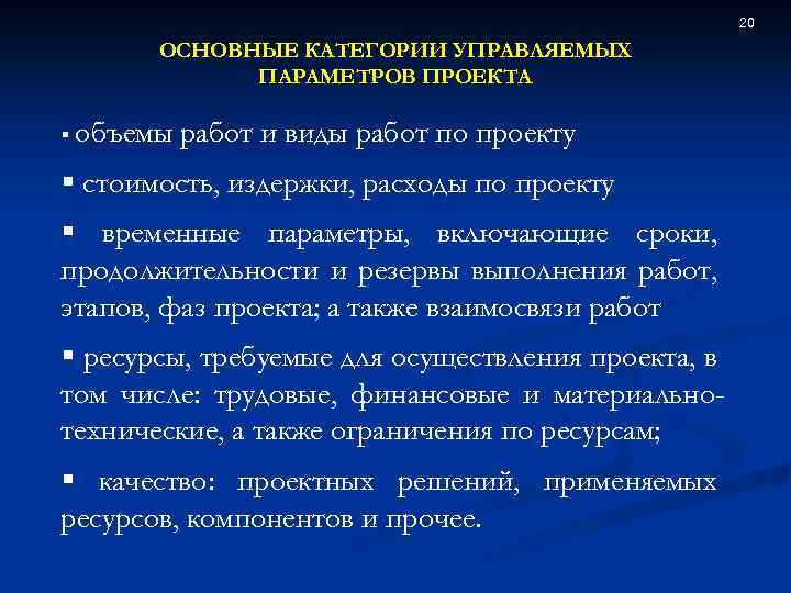20 ОСНОВНЫЕ КАТЕГОРИИ УПРАВЛЯЕМЫХ ПАРАМЕТРОВ ПРОЕКТА § объемы работ и виды работ по проекту § стоимость, издержки, расходы по проекту § временные параметры, включающие сроки, продолжительности и резервы выполнения работ, этапов, фаз проекта; а также взаимосвязи работ § ресурсы, требуемые для осуществления проекта, в том числе: трудовые, финансовые и материальнотехнические, а также ограничения по ресурсам; § качество: проектных решений, применяемых ресурсов, компонентов и прочее.
