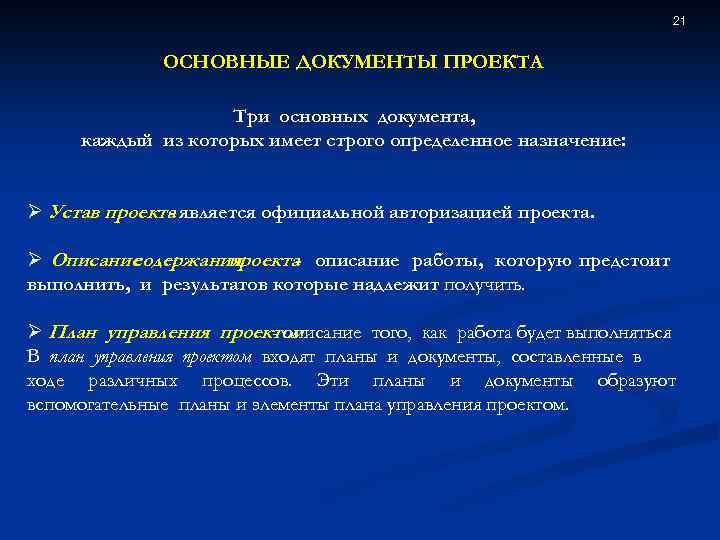 21 ОСНОВНЫЕ ДОКУМЕНТЫ ПРОЕКТА Три основных документа, каждый из которых имеет строго определенное назначение: Ø Устав проекта является официальной авторизацией проекта. Ø Описание содержания проекта- описание работы, которую предстоит выполнить, и результатов которые надлежит получить. Ø План управления проектом - описание того, как работа будет выполняться В план управления проектом входят планы и документы, составленные в ходе различных процессов. Эти планы и документы образуют вспомогательные планы и элементы плана управления проектом.