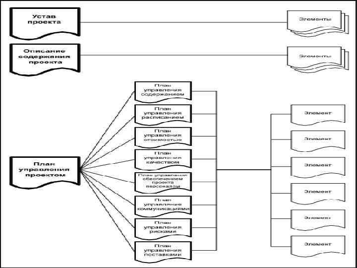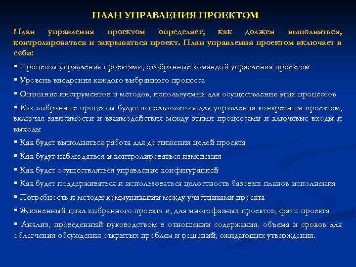 ПЛАН УПРАВЛЕНИЯ ПРОЕКТОМ План управления проектом определяет, как должен выполняться, контролироваться и закрываться проект. План управления проектом включает в себя: § Процессы управления проектами, отобранные командой управления проектом § Уровень внедрения каждого выбранного процесса § Описание инструментов и методов, используемых для осуществления этих процессов § Как выбранные процессы будут использоваться для управления конкретным проектом, включая зависимости и взаимодействия между этими процессами и ключевые входы и выходы § Как будет выполняться работа для достижения целей проекта § Как будут наблюдаться и контролироваться изменения § Как будет осуществляться управление конфигурацией § Как будет поддерживаться и использоваться целостность базовых планов исполнения § Потребность и методы коммуникации между участниками проекта § Жизненный цикл выбранного проекта и, для многофазных проектов, фазы проекта § Анализ, проведенный руководством в отношении содержания, объема и сроков для облегчения обсуждения открытых проблем и решений, ожидающих утверждения.