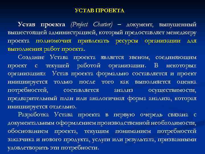 УСТАВ ПРОЕКТА Устав проекта (Project Charter) – документ, выпущенный вышестоящей администрацией, который предоставляет менеджеру проекта полномочия привлекать ресурсы организации для выполнения работ проекта. Создание Устава проекта является звеном, соединяющим проект с текущей работой организации. В некоторых организациях Устав проекта формально составляется и проект инициируется только после того как выполняется оценка потребностей, составляется анализ осуществимости, предварительный план или аналогичная форма анализа, которая инициируется отдельно. Разработка Устава проекта в первую очередь связана с документальным оформлением производственной необходимости, обоснованием проекта, текущим пониманием потребностей заказчика и нового продукта, услуги или результата, призванными удовлетворить эти потребности.