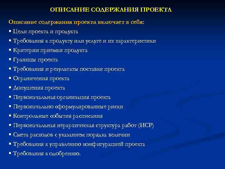 ОПИСАНИЕ СОДЕРЖАНИЯ ПРОЕКТА Описание содержания проекта включает в себя: § Цели проекта и продукта § Требования к продукту или услуге и их характеристики § Критерии приемки продукта § Границы проекта § Требования и результаты поставки проекта § Ограничения проекта § Допущения проекта § Первоначальная организация проекта § Первоначально сформулированные риски § Контрольные события расписания § Первоначальная иерархическая структура работ (ИСР) § Смета расходов с указанием порядка величин § Требования к управлению конфигурацией проекта § Требования к одобрению.