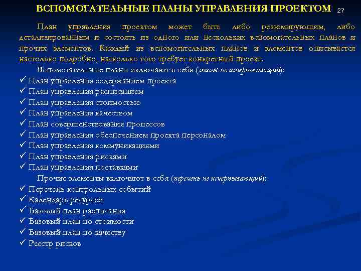 ВСПОМОГАТЕЛЬНЫЕ ПЛАНЫ УПРАВЛЕНИЯ ПРОЕКТОМ 27 План управления проектом может быть либо резюмирующим, либо детализированным и состоять из одного или нескольких вспомогательных планов и прочих элементов. Каждый из вспомогательных планов и элементов описывается настолько подробно, насколько того требует конкретный проект. Вспомогательные планы включают в себя (список не исчерпывающий): ü План управления содержанием проекта ü План управления расписанием ü План управления стоимостью ü План управления качеством ü План совершенствования процессов ü План управления обеспечением проекта персоналом ü План управления коммуникациями ü План управления рисками ü План управления поставками Прочие элементы включают в себя (перечень не исчерпывающий): ü Перечень контрольных событий ü Календарь ресурсов ü Базовый план расписания ü Базовый план по стоимости ü Базовый план по качеству ü Реестр рисков