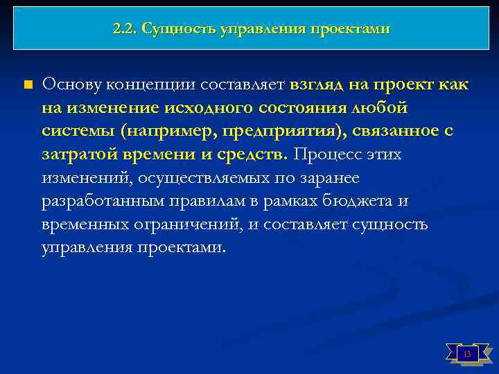 2. 2. Сущность управления проектами n Основу концепции составляет взгляд на проект как на изменение исходного состояния любой системы (например, предприятия), связанное с затратой времени и средств. Процесс этих изменений, осуществляемых по заранее разработанным правилам в рамках бюджета и временных ограничений, и составляет сущность управления проектами. 13