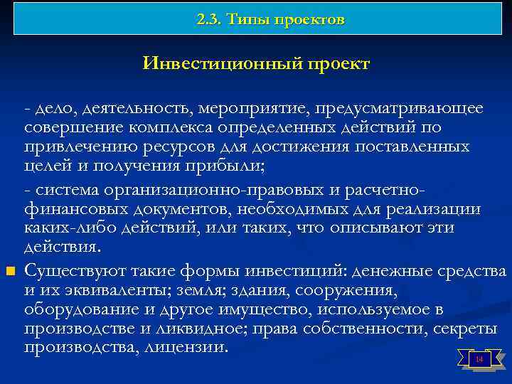 2. 3. Типы проектов n Венчурный проект предполагает выведение на рынок высокотехнологичных и конкурентоспособных продуктов. Такое инвестирование предполагает высокую степень риска, но, в то же время, и большую прибыль для инвестора. Для инвестора важен именно финансовый результат проекта (т. е. прибыль), венчурное финансирование не предназначено для поддержки научных исследований, которые не предполагают создание и последующий вывод на рынок продукта с коммерческой перспективой.