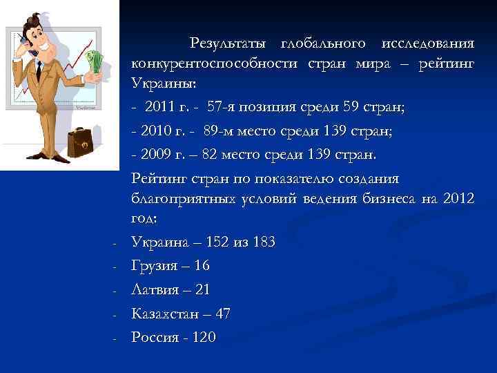 - Результаты глобального исследования конкурентоспособности стран мира – рейтинг Украины: - 2011 г. - 57 -я позиция среди 59 стран; - 2010 г. - 89 -м место среди 139 стран; - 2009 г. – 82 место среди 139 стран. Рейтинг стран по показателю создания благоприятных условий ведения бизнеса на 2012 год: Украина – 152 из 183 Грузия – 16 Латвия – 21 Казахстан – 47 Россия - 120