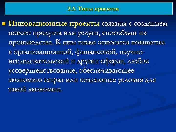 2. 3. Типы проектов n Инновационные проекты связаны с созданием нового продукта или услуги, способами их производства. К ним также относятся новшества в организационной, финансовой, научноисследовательской и других сферах, любое усовершенствование, обеспечивающее экономию затрат или создающее условия для такой экономии.