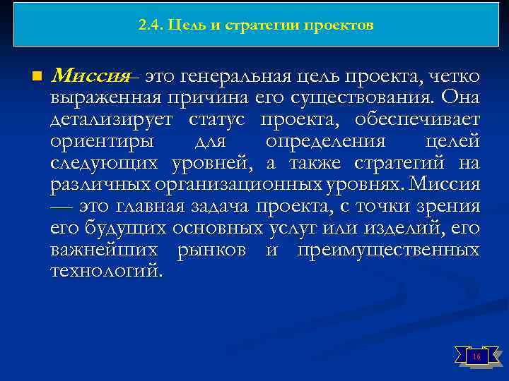 2. 4. Цель и стратегии проектов n Миссия это генеральная цель проекта, четко — выраженная причина его существования. Она детализирует статус проекта, обеспечивает ориентиры для определения целей следующих уровней, а также стратегий на различных организационных уровнях. Миссия — это главная задача проекта, с точки зрения его будущих основных услуг или изделий, его важнейших рынков и преимущественных технологий. 16