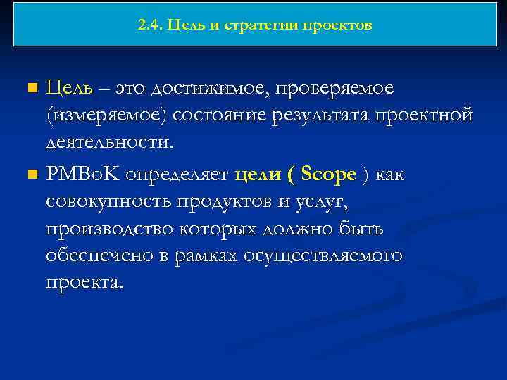 2. 4. Цель и стратегии проектов Цель – это достижимое, проверяемое (измеряемое) состояние результата проектной деятельности. n PMBo. K определяет цели ( Scope ) как совокупность продуктов и услуг, производство которых должно быть обеспечено в рамках осуществляемого проекта. n
