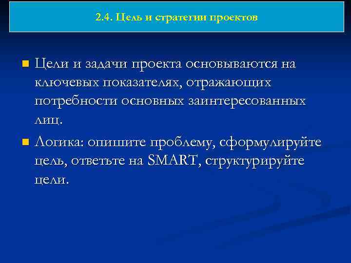 2. 4. Цель и стратегии проектов Цели и задачи проекта основываются на ключевых показателях, отражающих потребности основных заинтересованных лиц. n Логика: опишите проблему, сформулируйте цель, ответьте на SMART, структурируйте цели. n