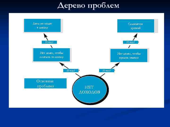 Дерево проблем Дети не ходят в школу Снижается урожай И что? Нет денег, чтобы платить за школу Нет денег, чтобы купить семена И что? Основная проблема И что? НЕТ ДОХОДОВ