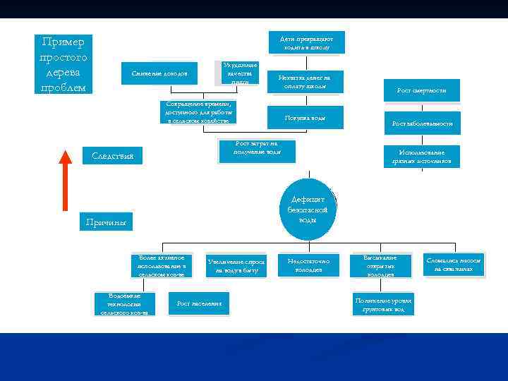 Пример простого дерева проблем Дети прекращают ходить в школу Ухудшение качества пищи Снижение доходов Нехватка денег на оплату школы Сокращение времени, доступного для работы в сельском хозяйстве Покупка воды Рост затрат на получение воды Следствия Рост смертности Рост заболеваемости Использование грязных источников Дефицит безопасной воды Причины Более активное использование в сельском хоз-ве Водоёмкие технологии сельского хоз-ва Увеличение спроса на воду в быту Рост населения Недостаточно колодцев Высыхание открытых колодцев Понижение уровня грунтовых вод Сломались насосы на скважинах