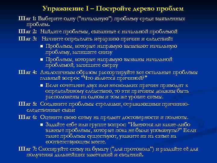 Упражнение I – Постройте дерево проблем Шаг 1: Выберите одну ("начальную") проблему среди выявленных проблем. Шаг 2: Найдите проблемы, связанные с начальной проблемой Шаг 3: Начните определять иерархию причин и следствий: n Проблемы, которые напрямую вызывают начальную проблему, запишите снизу n Проблемы, которые напрямую вызваны начальной проблемой, запишите сверху Шаг 4: Аналогичным образом рассортируйте все остальные проблемы главный вопрос "Что является причиной? " n Если сочетание двух или нескольких причин приводит к определённому следствию, то эти причины должны быть расположены на одном и том же уровне схемы. Шаг 5: Соедините проблемы стрелками, отражающими причинноследственные связи Шаг 6: Оцените свою схему на предмет достоверности и полноты. n Задайте себе или группе вопрос: "Имеются ли какие-либо важные проблемы, которые пока не были упомянуты? " Если такие проблемы существуют, укажите их на схеме на соответствующем месте. Шаг 7: Скопируйте схему на бумагу ("для протокола") и раздайте её для получения дальнейших замечаний и сведений.