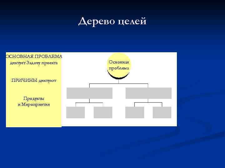 Дерево целей ОСНОВНАЯ ПРОБЛЕМА диктует Задачу проекта ПРИЧИНЫ диктуют Продукты и Мероприятия Основная проблема