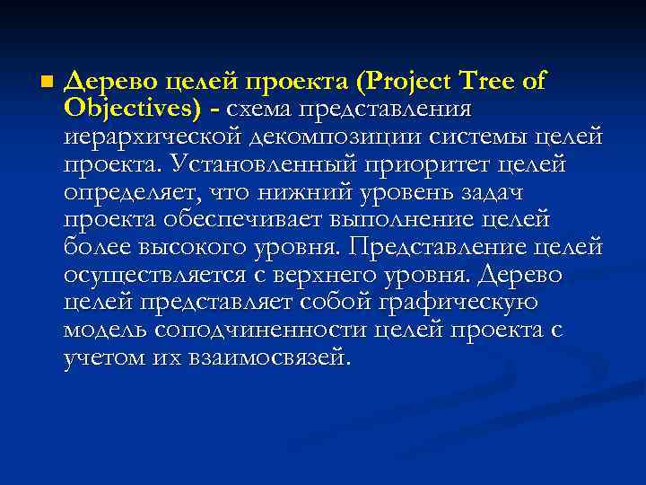 n Дерево целей проекта (Project Tree of Objectives) - схема представления иерархической декомпозиции системы целей проекта. Установленный приоритет целей определяет, что нижний уровень задач проекта обеспечивает выполнение целей более высокого уровня. Представление целей осуществляется с верхнего уровня. Дерево целей представляет собой графическую модель соподчиненности целей проекта с учетом их взаимосвязей.