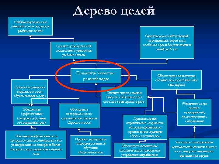 Дерево целей Стабилизировать или увеличить улов и доходы рыбацких семей Снизить кол-во заболеваний, передаваемых через воду, особенно среди бедных семей и детей до 5 лет Снизить угрозу речной экосистеме и увеличить рыбные запасы Повысить качество речной воды Снизить количество твёрдых отходов, сбрасываемых в реку Обеспечить эффективный контроль над теми, кто загрязняет реку Обеспечить соответствие сточных вод экологическим стандартам Снизить число семей и заводов, сбрасывающих сточные воды прямо в реку Обеспечить осведомлённость населения об опасности сброса отходов Обеспечить эффективность природоохранного агентства и его реагирование на интересы более широкого круга заинтересованных лиц Принять программы информирования и обучения общественности Принять новые нормативные документы, которые эффективно препятствуют прямому сбросу сточных вод Обеспечить повышение политического приоритета устранения загрязнений Увеличить долю семей и предприятий, подключенных к канализации Улучшить планирование деятельности местной власти, в т. ч. внедрить механизмы возмещения затрат