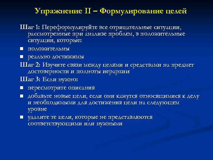 Упражнение IІ – Формулирование целей Шаг 1: Переформулируйте все отрицательные ситуации, рассмотренные при анализе проблем, в положительные ситуации, которые: n положительны n реально достижимы Шаг 2: Изучите связи между целями и средствами на предмет достоверности и полноты иерархии Шаг 3: Если нужно: n пересмотрите описания n добавьте новые цели, если они кажутся относящимися к делу и необходимыми для достижения цели на следующем уровне n удалите те цели, которые не представляются соответствующими или нужными
