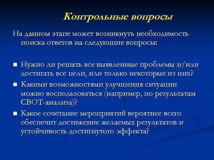 Контрольные вопросы На данном этапе может возникнуть необходимость поиска ответов на следующие вопросы: n n n Нужно ли решать все выявленные проблемы и/или достигать все цели, или только некоторые из них? Какими возможностями улучшения ситуации можно воспользоваться (например, по результатам СВОТ-анализа)? Какое сочетание мероприятий вероятнее всего обеспечит достижение желаемых результатов и устойчивость достигнутого эффекта?