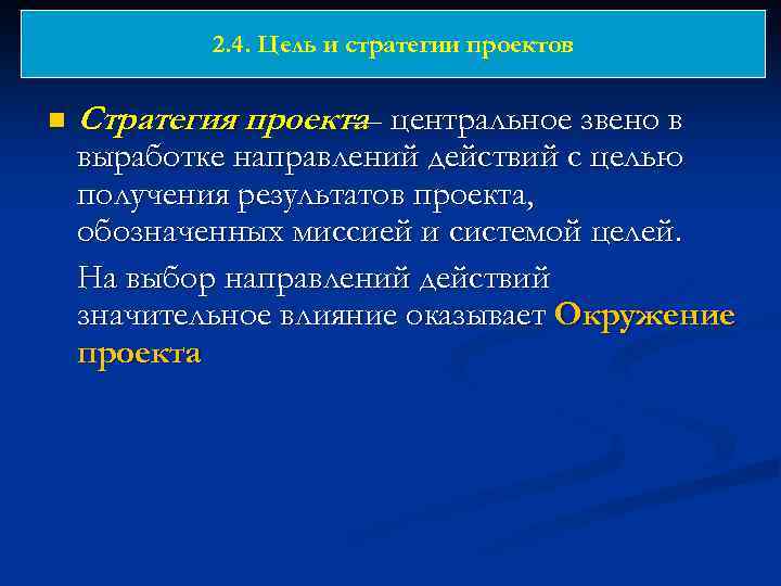 2. 4. Цель и стратегии проектов n Стратегия проекта центральное звено в — выработке направлений действий с целью получения результатов проекта, обозначенных миссией и системой целей. На выбор направлений действий значительное влияние оказывает Окружение проекта