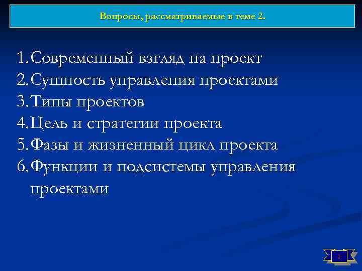 Вопросы, рассматриваемые в теме 2. 1. Современный взгляд на проект 2. Сущность управления проектами 3. Типы проектов 4. Цель и стратегии проекта 5. Фазы и жизненный цикл проекта 6. Функции и подсистемы управления проектами 1
